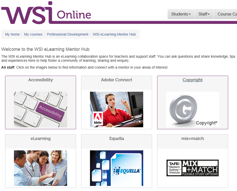 The eLearning mentor hub is located on the WSI Online: https://wsionline.wsi.tafensw.edu.au/enrol/index.php?id=3005. Staff in Western Sydney Institute should email: wsi.online@tafensw.edu.au for the enrolment key.